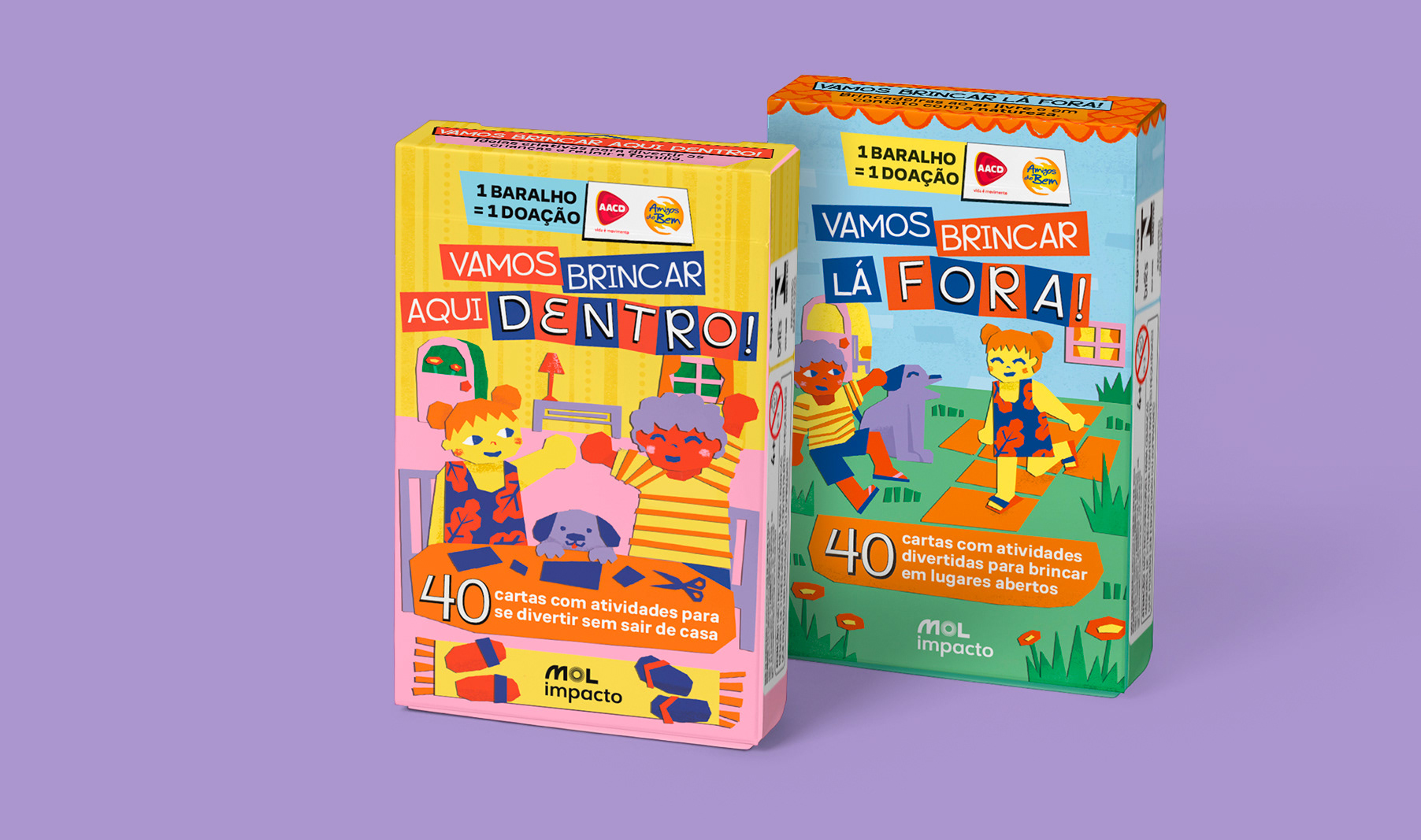 Projeto gráfico, briefing das ilustrações e design dos baralhos Vamos Brincar Lá Fora e Vamos Brincar Aqui Dentro, em parceria com a equipe interna MOL, para a RiHappy e PBKids.